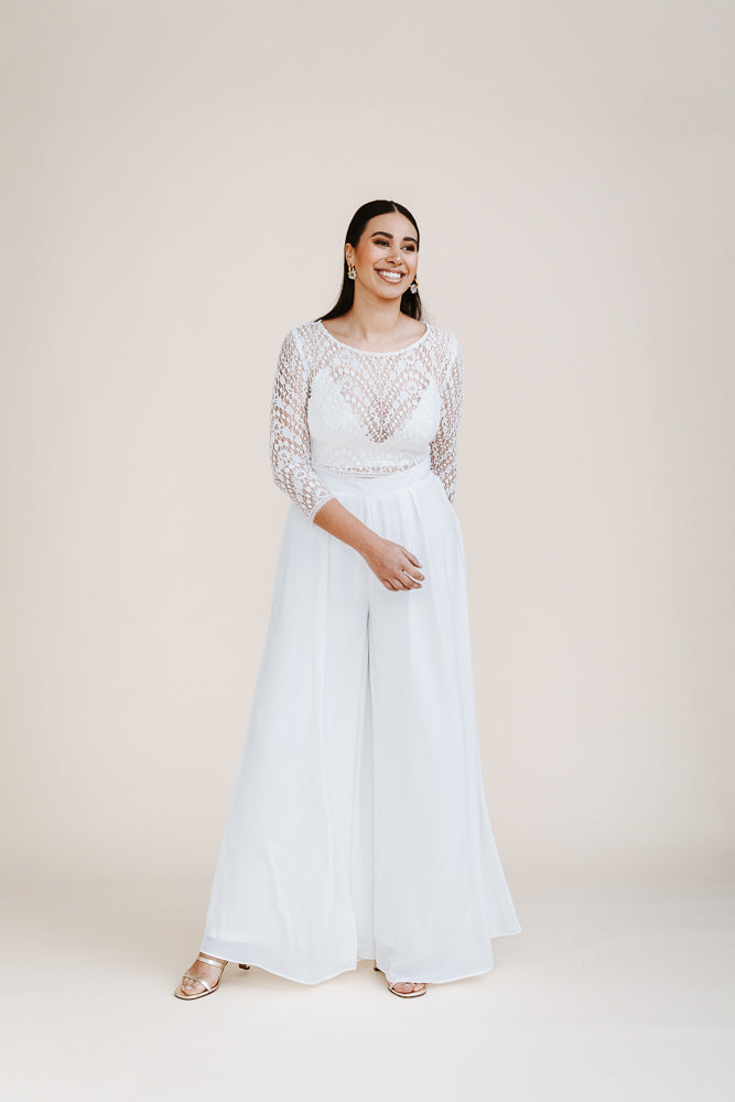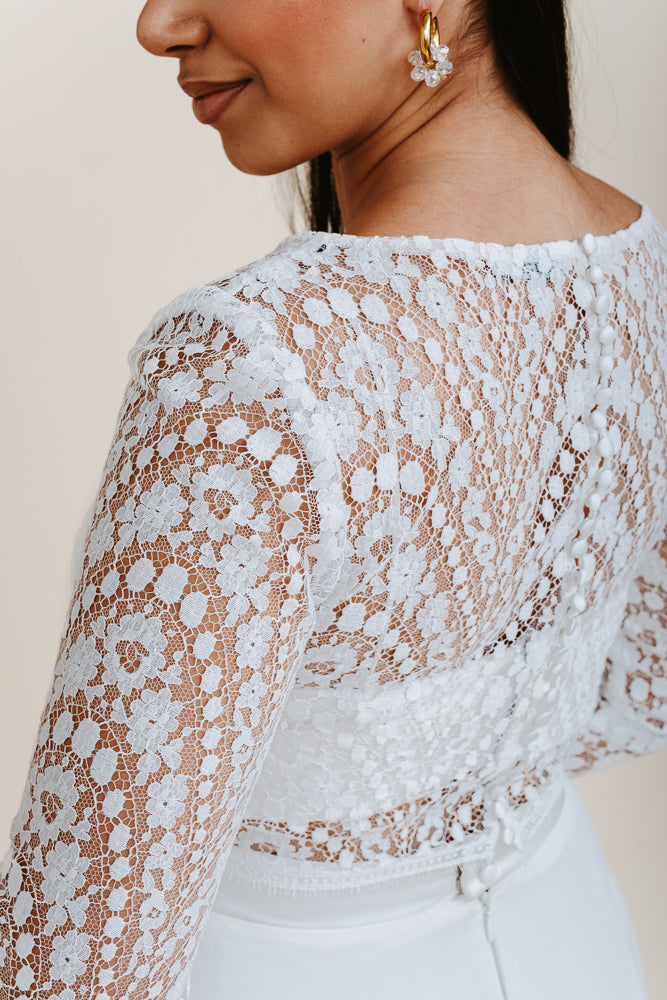 Wunderschönes, verspieltes Spitzentop aus französischer Baumwollspitze. Der Dreiviertelärmel schmiegt sich weich an den Arm, wobei die Bogenkanten mit Wimpernspitze den Saum nochmal leicht akzentuieren. Im Rücken verläuft eine Knopfleiste aus bezogenen Satinknöpfen, die nochmal für ein extra Highlight sorgt!