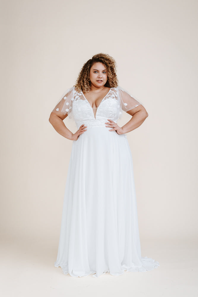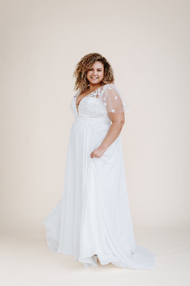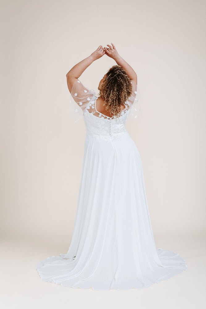 Ein Traum aus recyceltem Chiffon und italienischer Tüllspitze. Die leichten Flügelärmel umspielen charmant die Oberarme. Das Zusammenspiel aus transparentem Tüll mit dem sanften Schimmer des Viskose-Satin aus der Corsage sorgen für Aufregende Details im Oberteil.